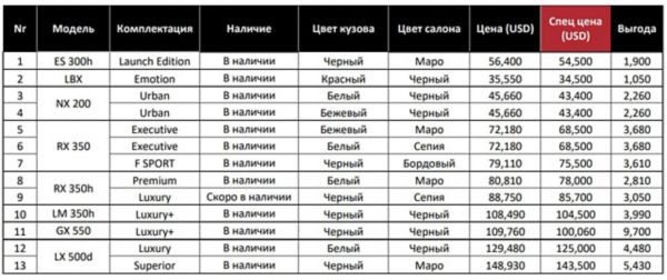 В первую неделю декабря модели Lexus, доступные в наличии, получают специальные скидки, действующие в пределах имеющегося стока. Подробная информация о моделях, включённых в кампанию, представлена в прилагаемой таблице. Это отличная возможность для тех, кто хочет приобрести премиальный автомобиль, сочетающий в себе роскошь, передовые технологии и высокую производительность, по выгодной цене.